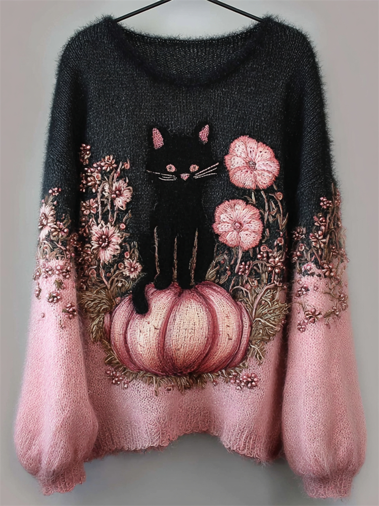 Black Cat & Pink Pumpkin Floral Embroidered Contrast Fuzzy Cozy Sweater