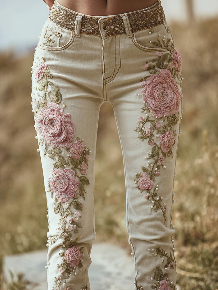Bohemian Style Pink Rose Embroidery Pattern Women's Skinny Jeans