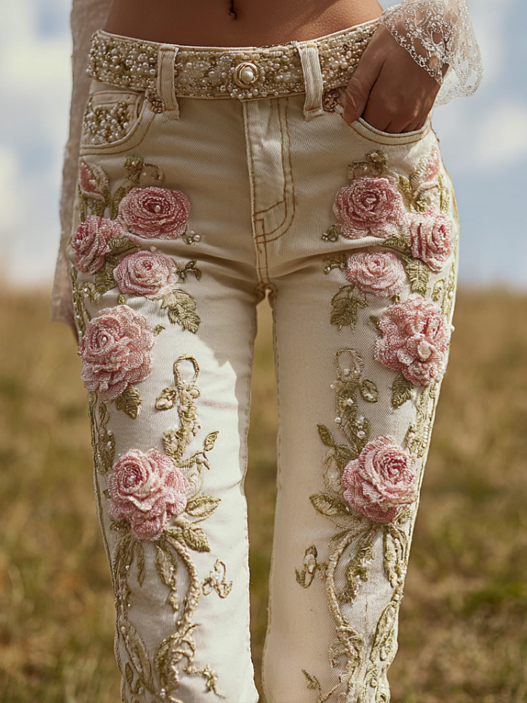 Bohemian Style Pink Rose Embroidery Pattern Women's Skinny Jeans