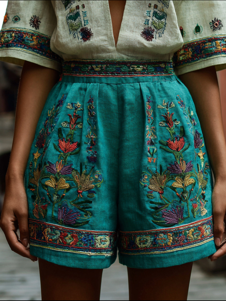 Bohemian Style Plant Small Flower Embroidery Shorts