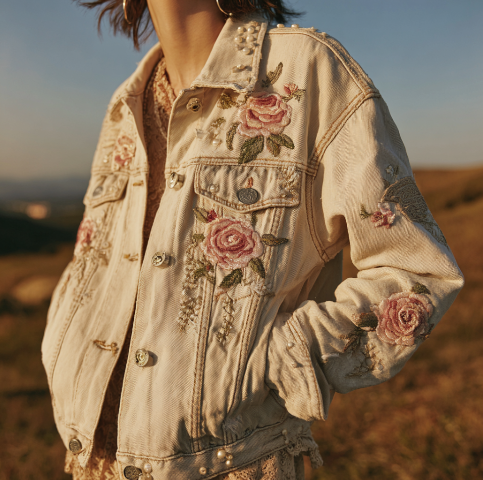 Bohemian Style Rose Embroidery Women's Retro Casual Denim Jacket