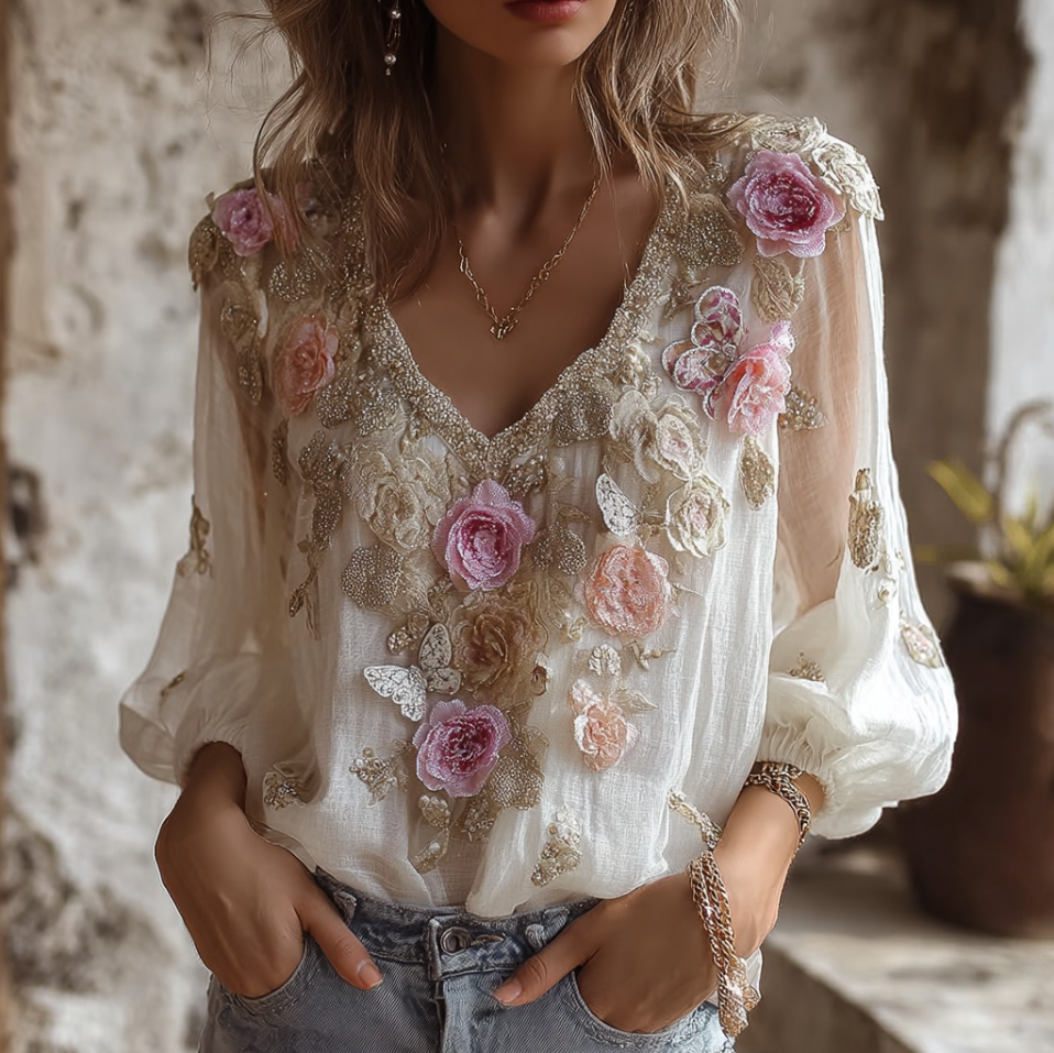 Bohemian Style V-neck Butterfly And Flower Embroidery Cotton And Linen Top