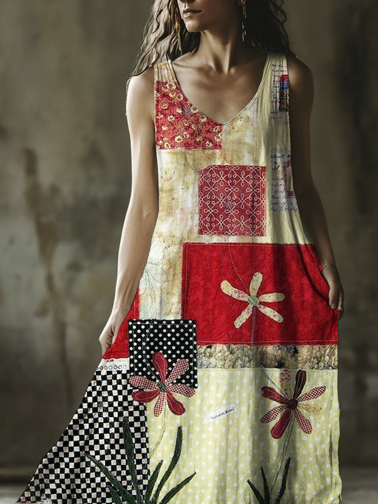 Boho Floral Patchwork Art Vintage Women's Linen Vest Dress