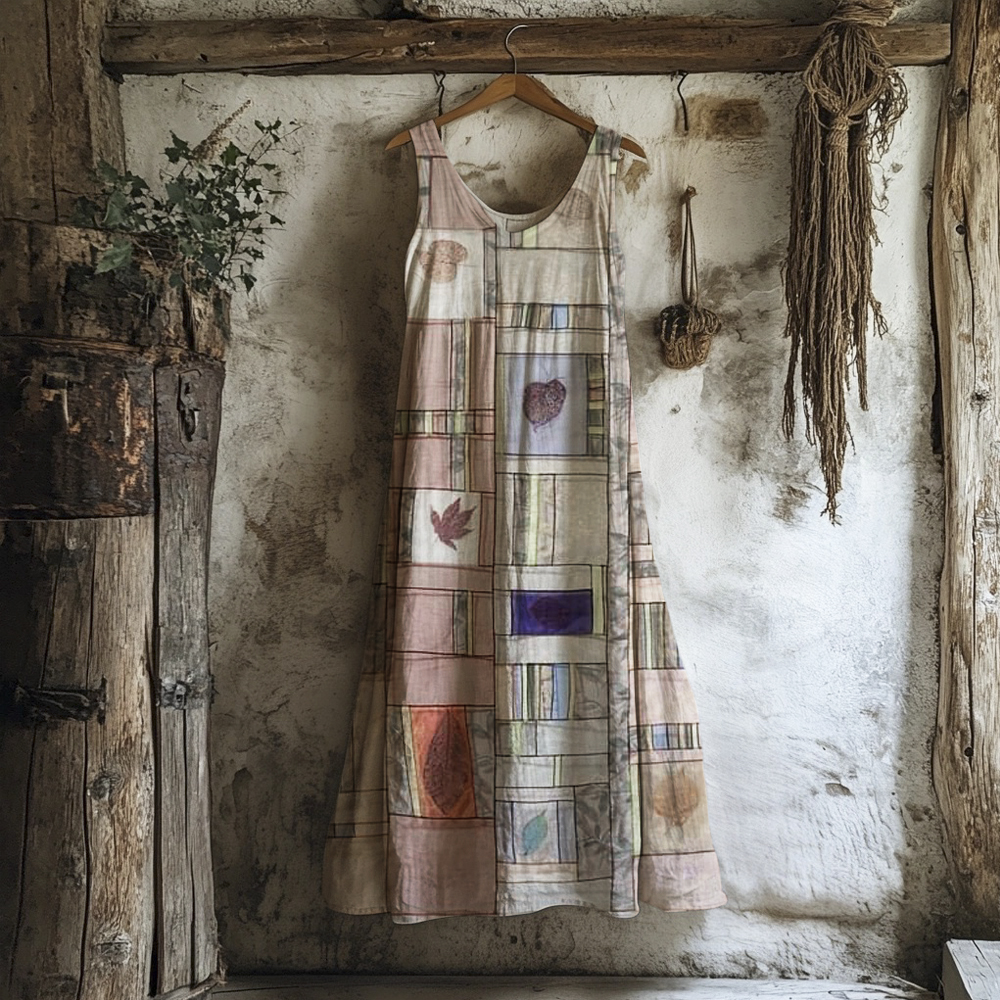 Boho Leaf Patchwork Art Vintage Women's Linen Vest Dress