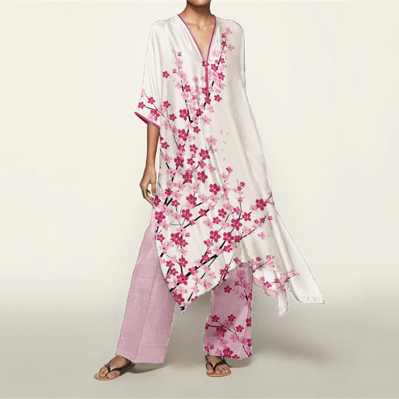 Classy Cherry Blossom Art Flowy Kaftan & Pants Set