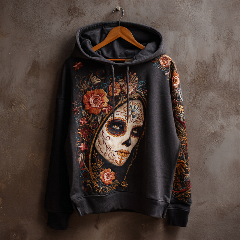 Day Of The Dead Sugar Skull Woman Floral Embroidered Hoodie