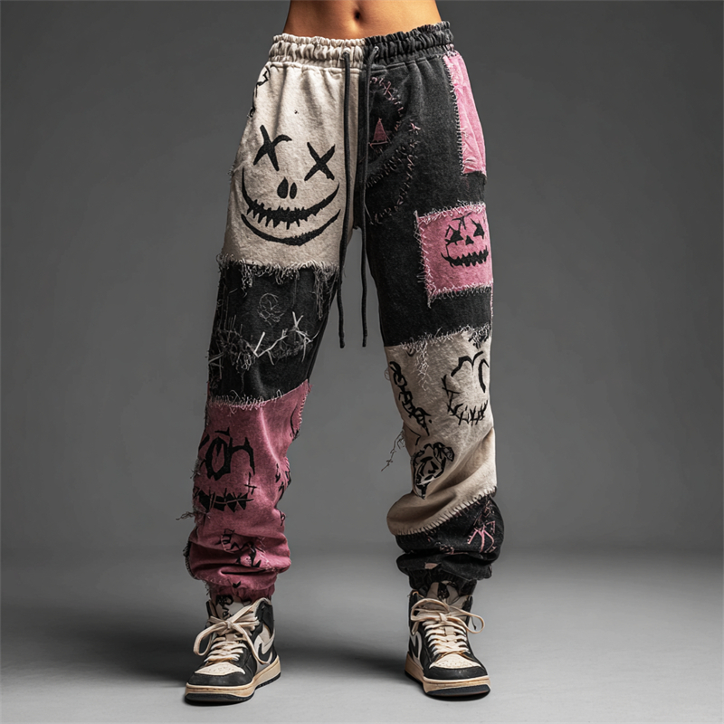 Halloween Monster Faces Graffiti Colorblock Patchwork Sweatpants
