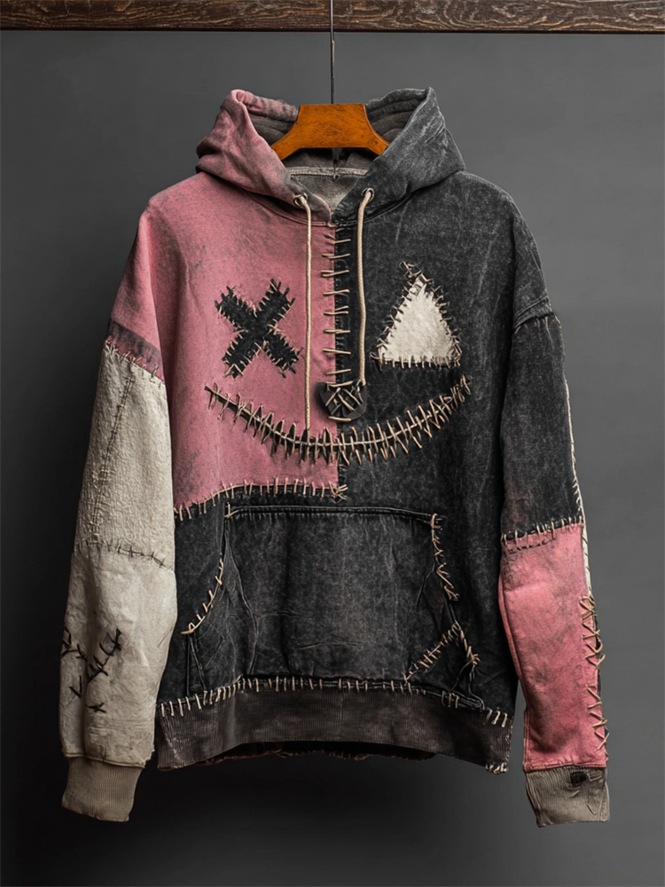 Halloween Stitched Face Colorblock Patchwork Washed Hoodie