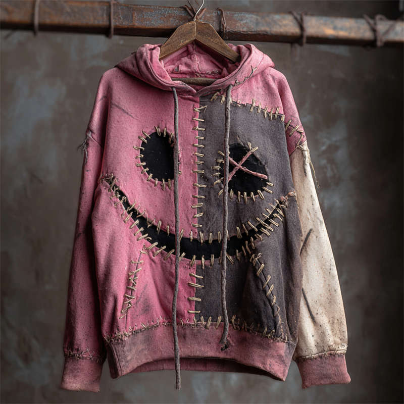 Halloween Stitched Monster Face Contrast Washed Hoodie