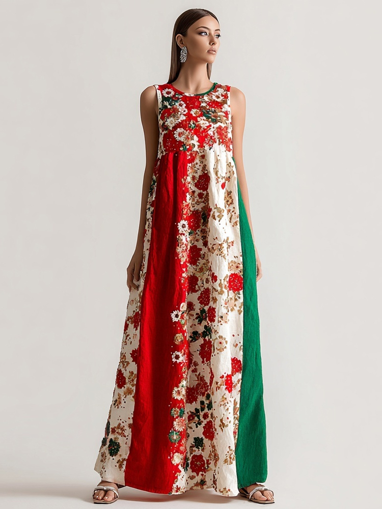 Iranian Flag Color Inspired Floral Pattern Linen Maxi Dress
