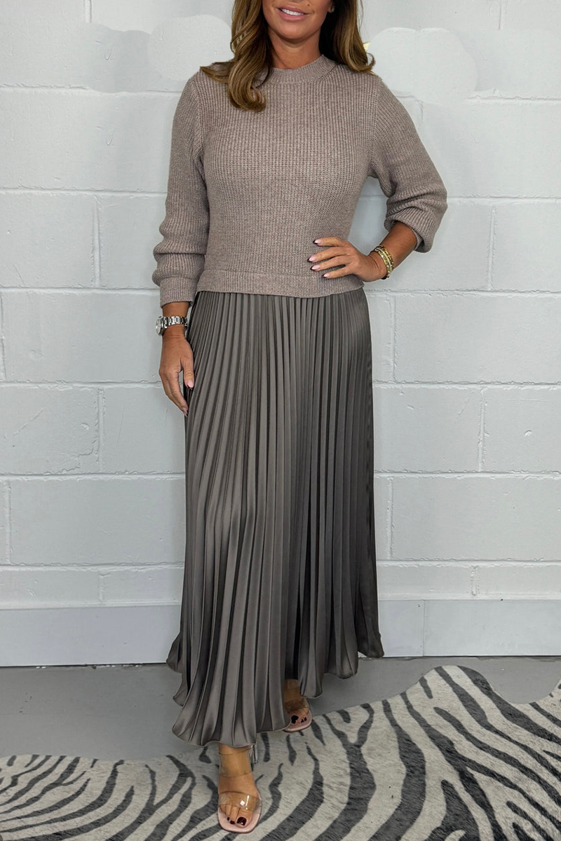 Step into a world of refined comfort with this taupe two-texture midi dress—a seamless blend of cozy ribbed knit, luxe satin pleats, and muted elegance for the woman who wants to look polished yet relaxed in any setting.