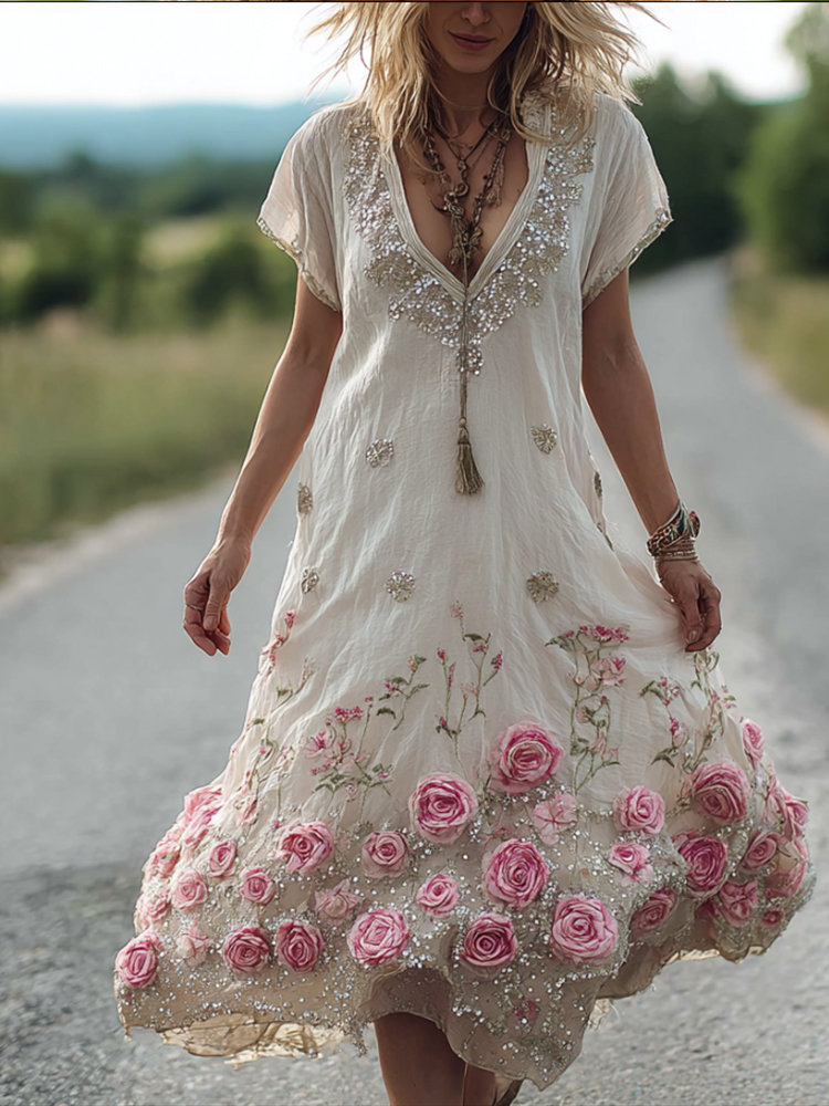 Ladies' Short-sleeved V-neck Vintage Dress With Sequin Embroidery Flowers