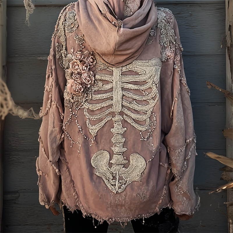 Skeleton Pink Floral Beaded Washed Cozy Hoodie