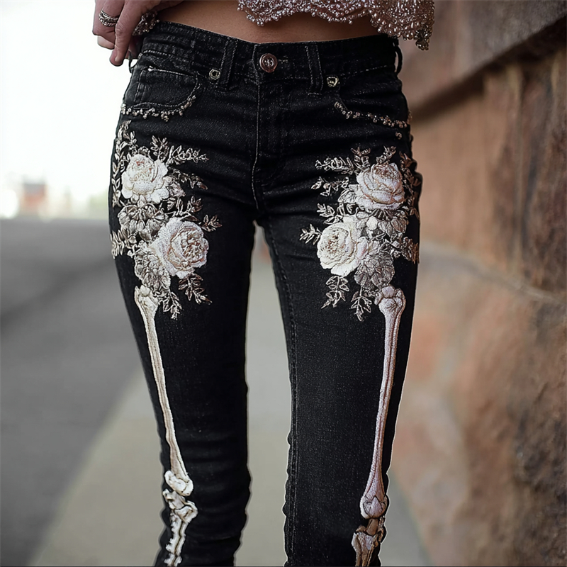 Skeleton Pink Roses Beaded Embroidered Dark Washed Jeans