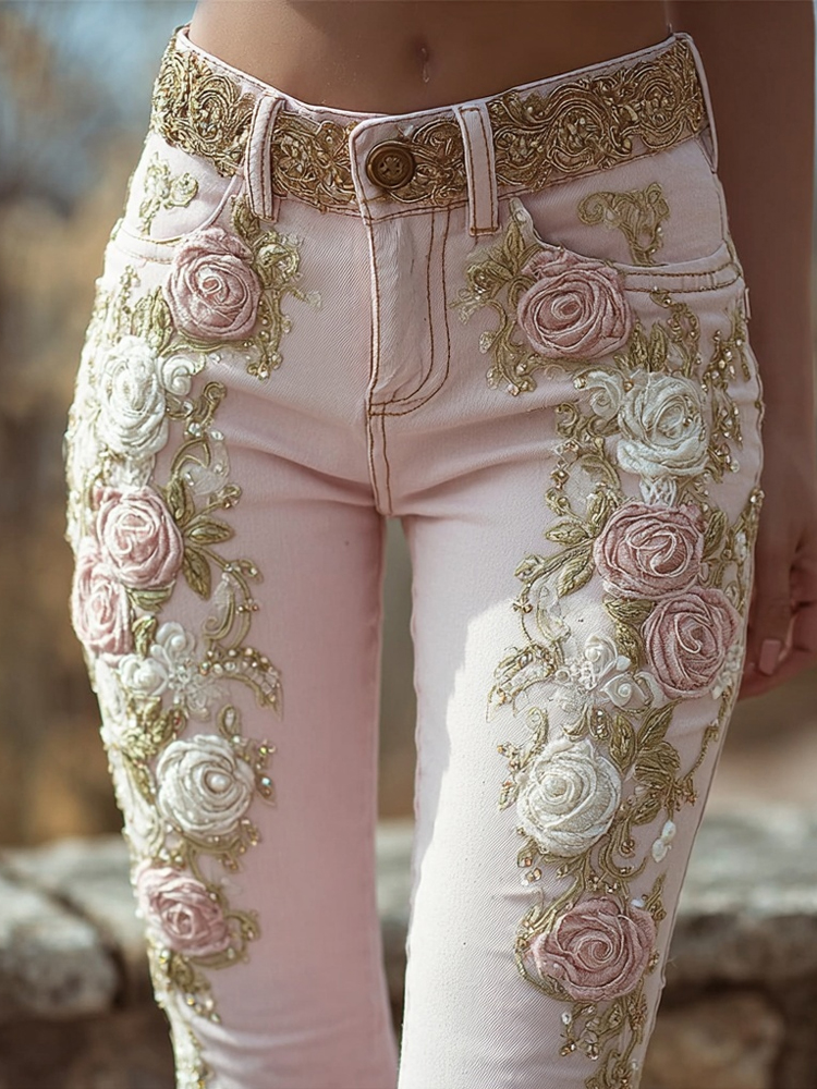 Vintage Boho Roses Embroidered Pink Skinny Jeans