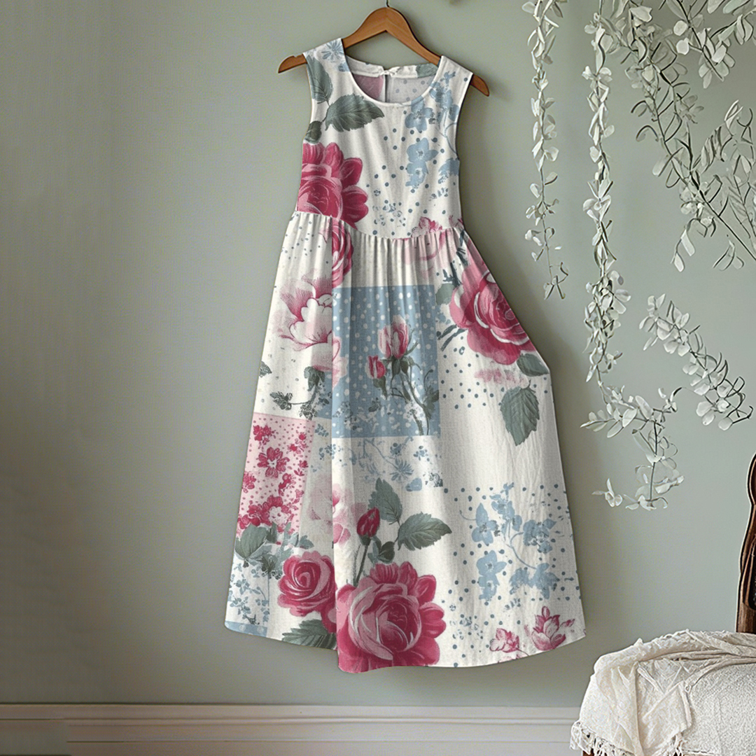 Vintage Floral Patchwork Art Linentank Midi Dress