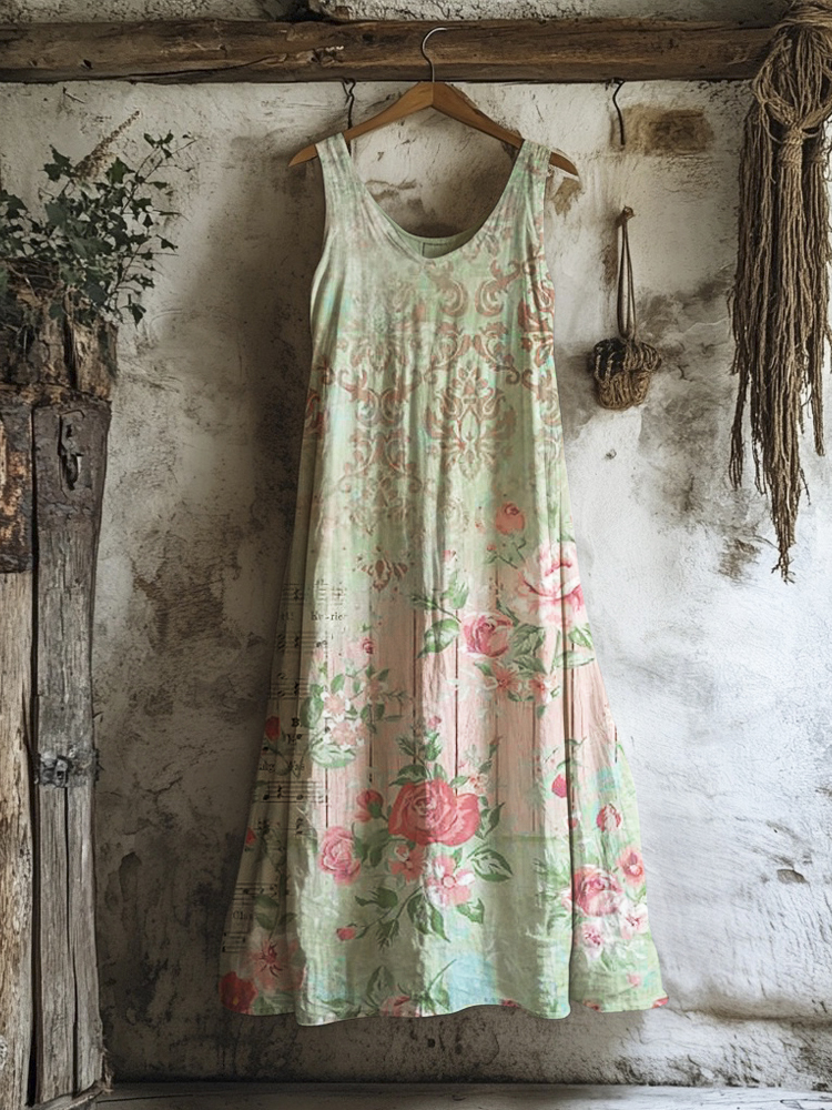 Vintage Floral Print Women's Linen Vest Dress