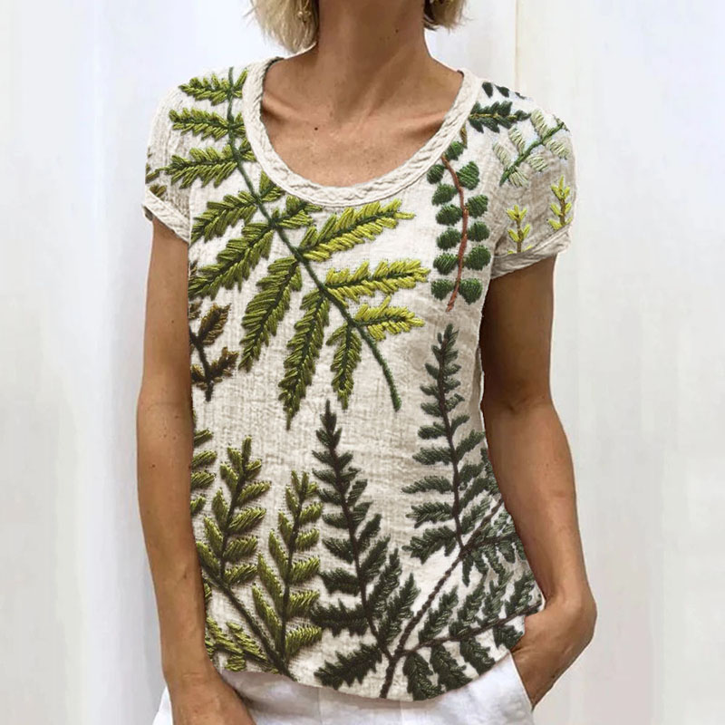 Vintage Forest Fern Leaves Embroidered Linen Shirt
