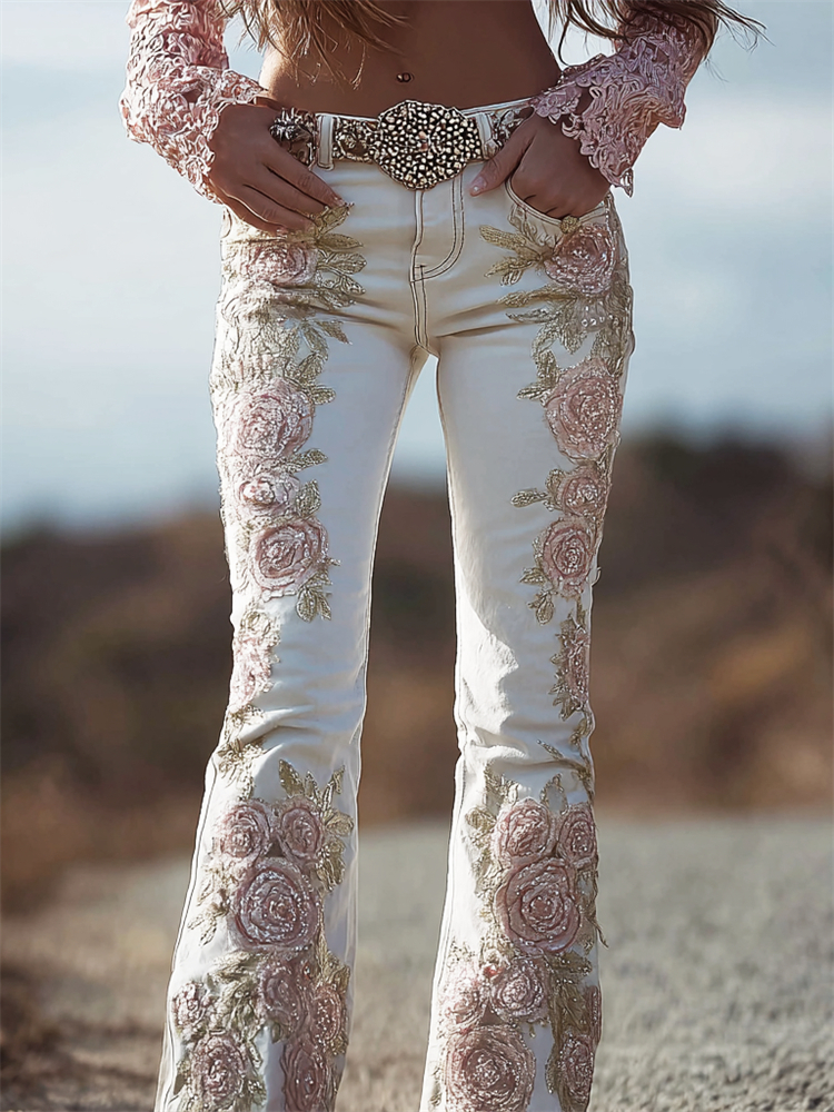 Vintage Glitter Roses Embroidered Bootcut Jeans