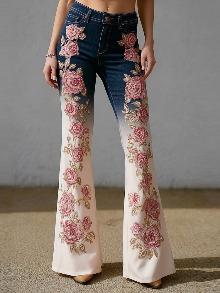 Vintage Pink Roses Glitter Embroidered Gradient Bootcut Jeans