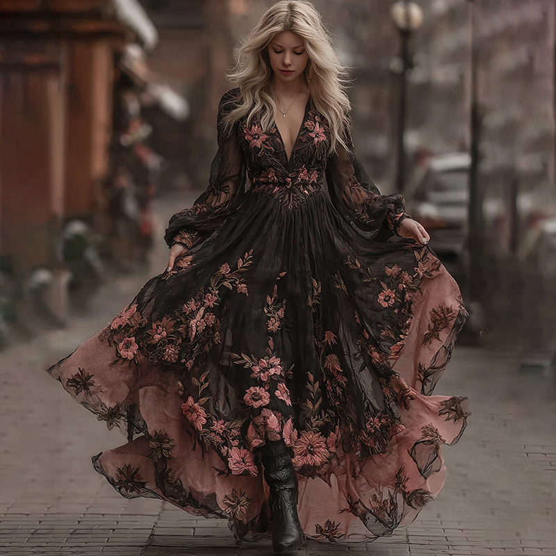 Vintage Rose Floral Lace Art V Neck Long Sleeve Maxi Dress