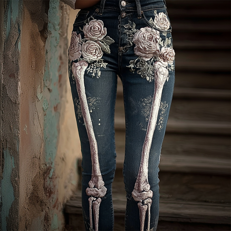 Vintage Skeleton Pink Roses Beaded Embroidered Washed Jeans