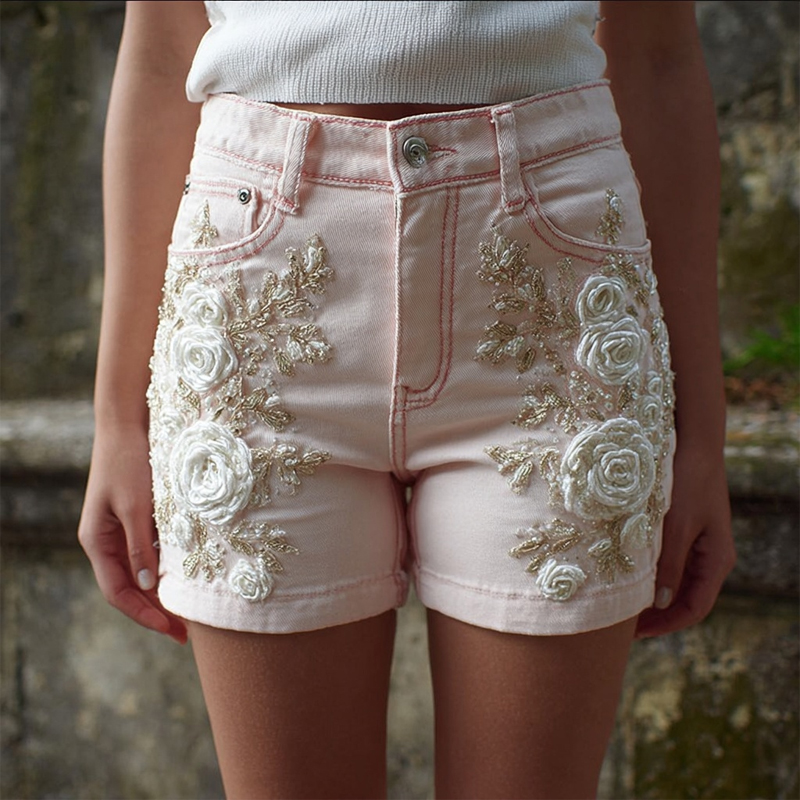 Vintage White Roses Embroidered Pink Denim Shorts