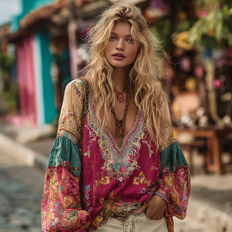 Women's Bohemian Floral Embroidery Art Linen Blend Shirt