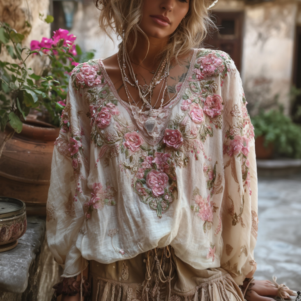 Women's Bohemian Style Three-dimensional Pink Embroidered Floral Vintage Round Neck Long-sleeved Top