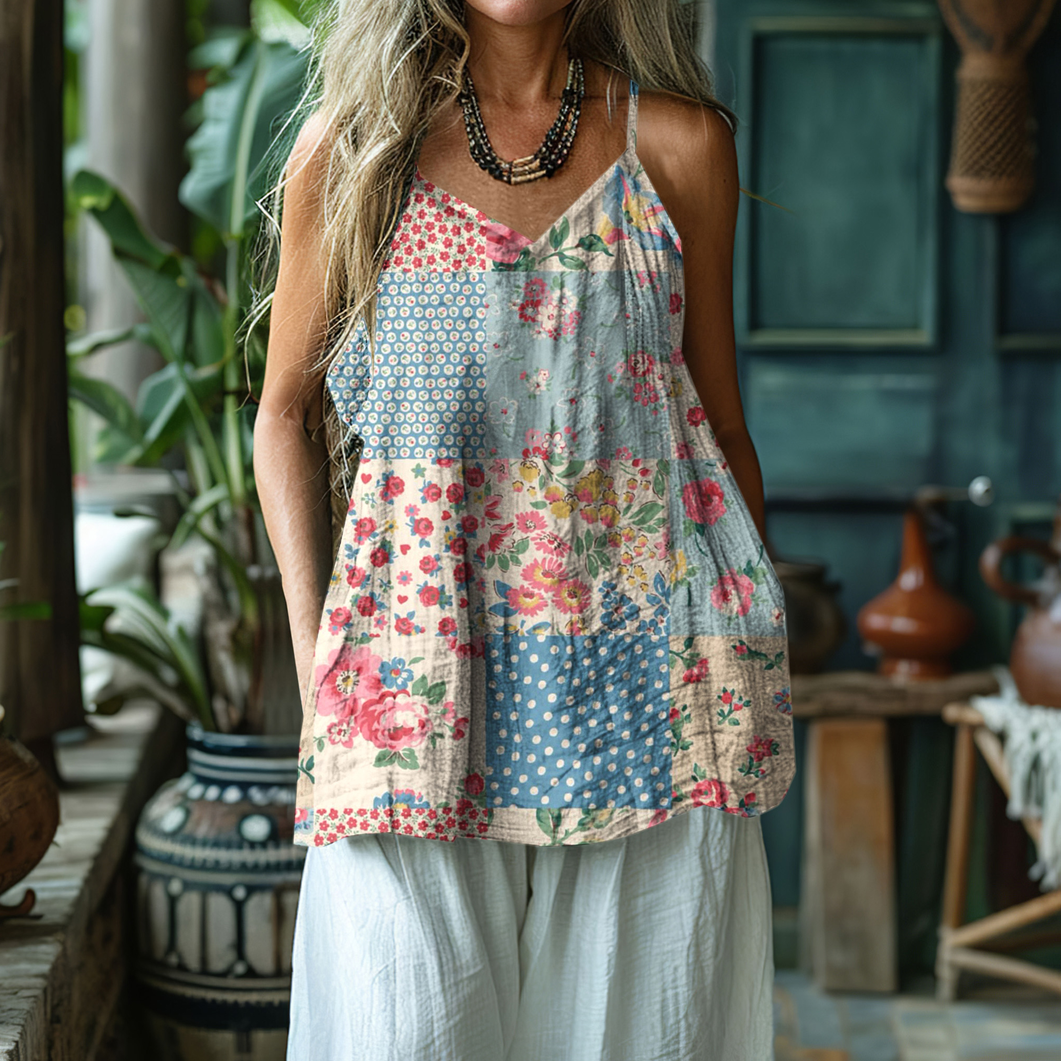 Women's Floral Patchwork Art Linen And Cotton Camisole