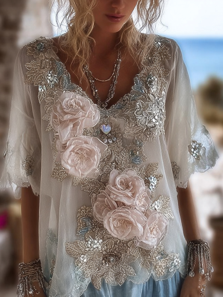 Women's Light-colored Floral Short-sleeved V-neck Top