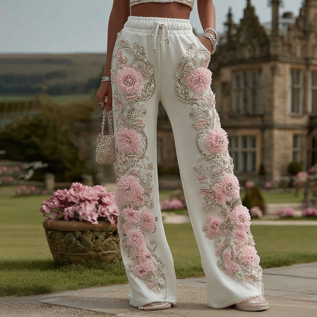 Women's Pink Floral Embroidery Art Sweatpants