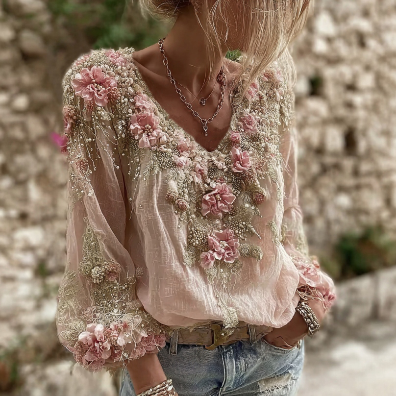 Women's Pink Floral Embroidery Art V-neck Long Sleeve Linen Blend T-shirt