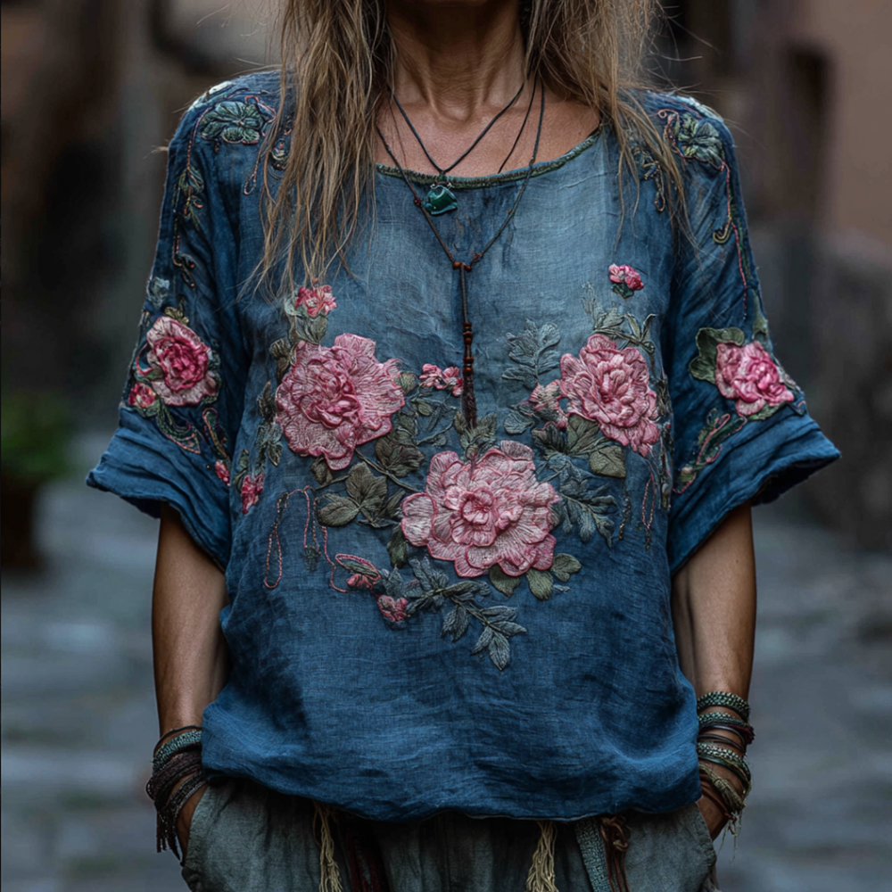 Women's Pink Flower Blue Tie-dye Short-sleeved Shirt