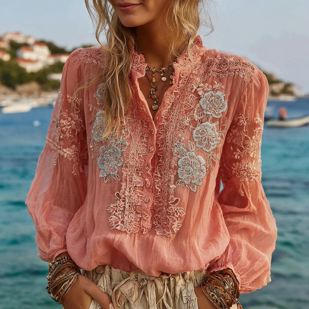 Women's Pink Rose Embroidered Casual Button-down Shirt
