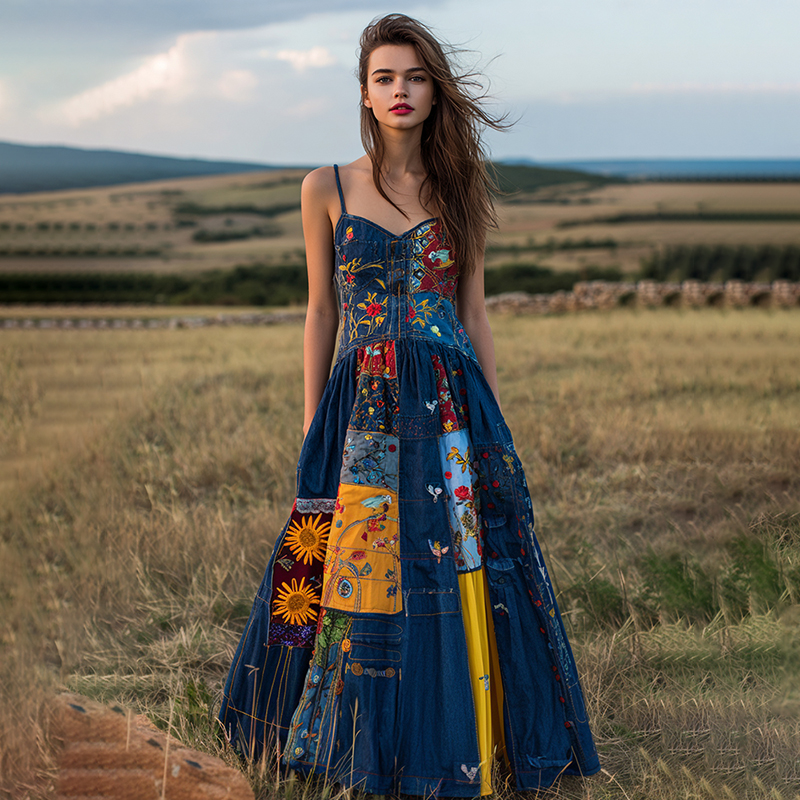 Women's Retro Ethnic Floral Stitching Denim Suspender Dress