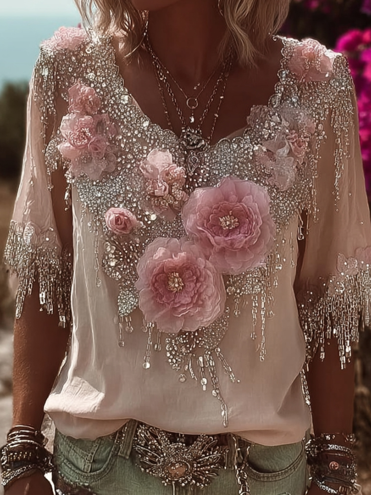 Women's Three-dimensional Floral Retro Casual Short-sleeved Shirt