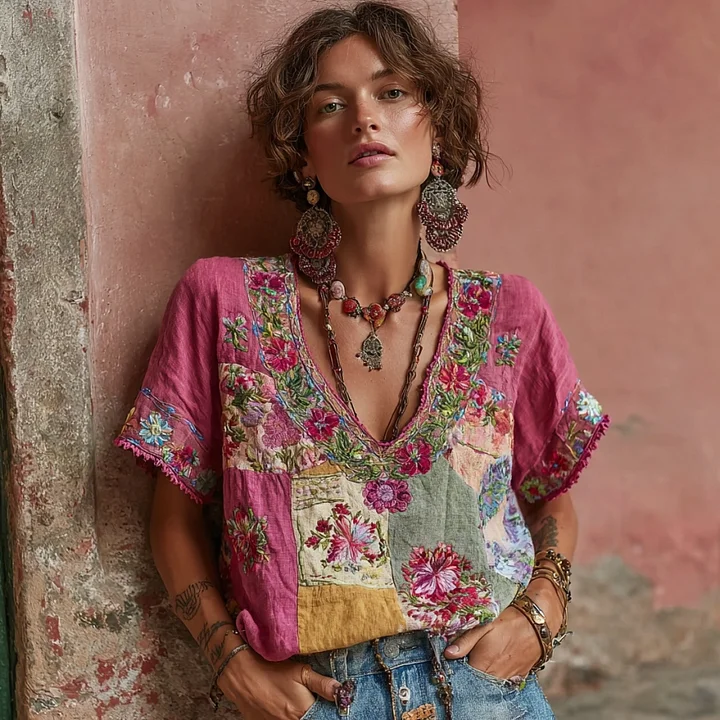 Women's Vintage Bohemian Floral Embroidery Art V-neck Linen Blend T-shirt