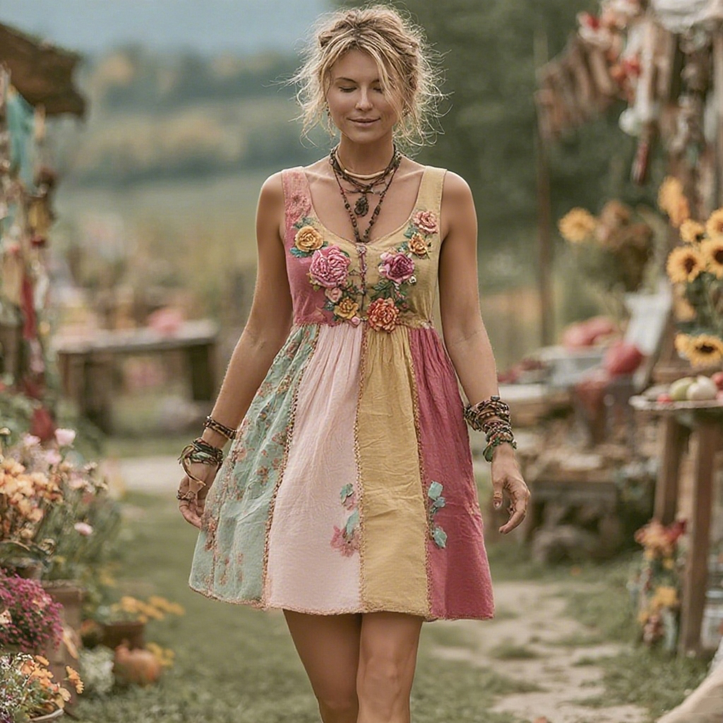 Women's Vintage Bohemian Floral Panel Sleeveless Dress