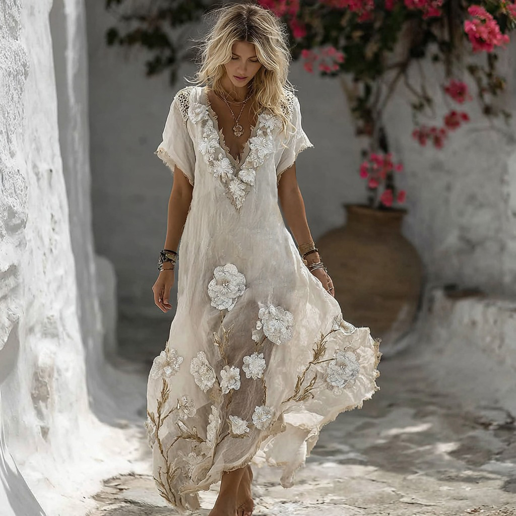 Women's Vintage Floral Embroidery Art Comfy Linen Maxi Dress