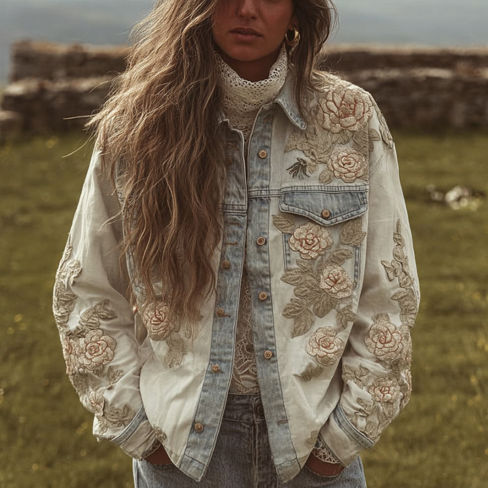 Women's Vintage Floral Embroidery Long-sleeved Denim Jacket