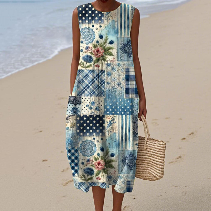 Women's Vintage Floral Patch Sleeveless Cotton Dress