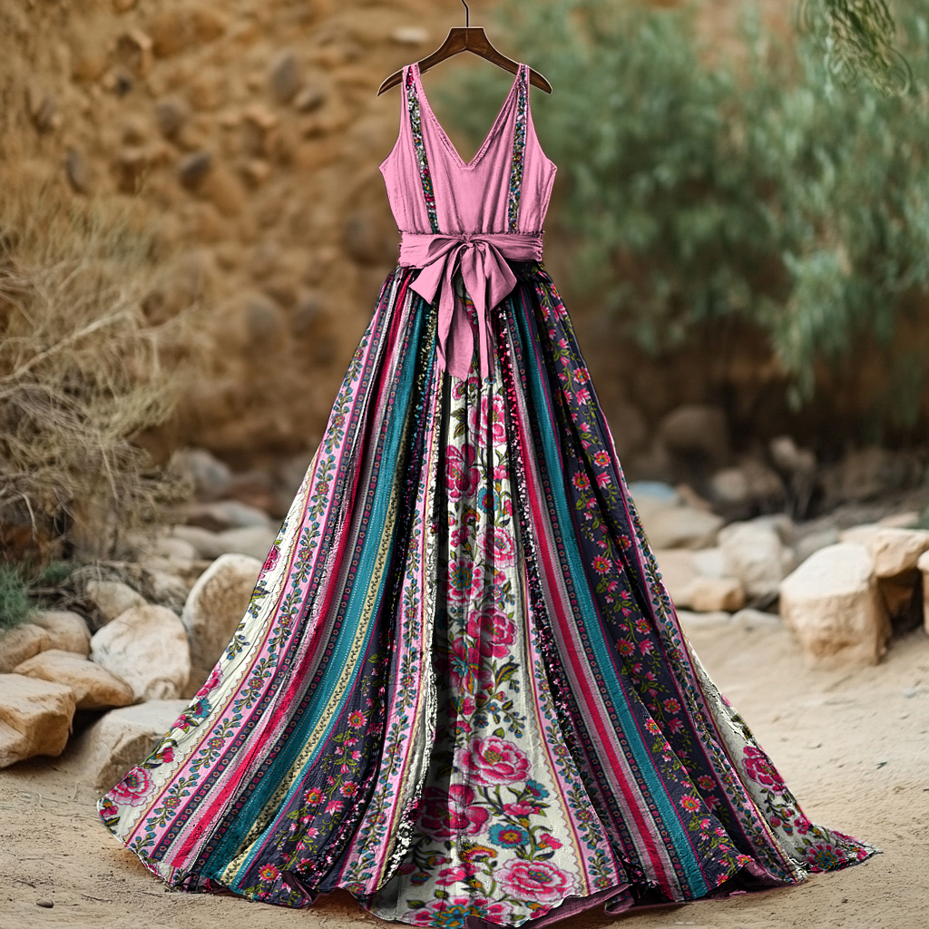 Women's Vintage Floral Patchwork Cotton And Linen Sleeveless Dress