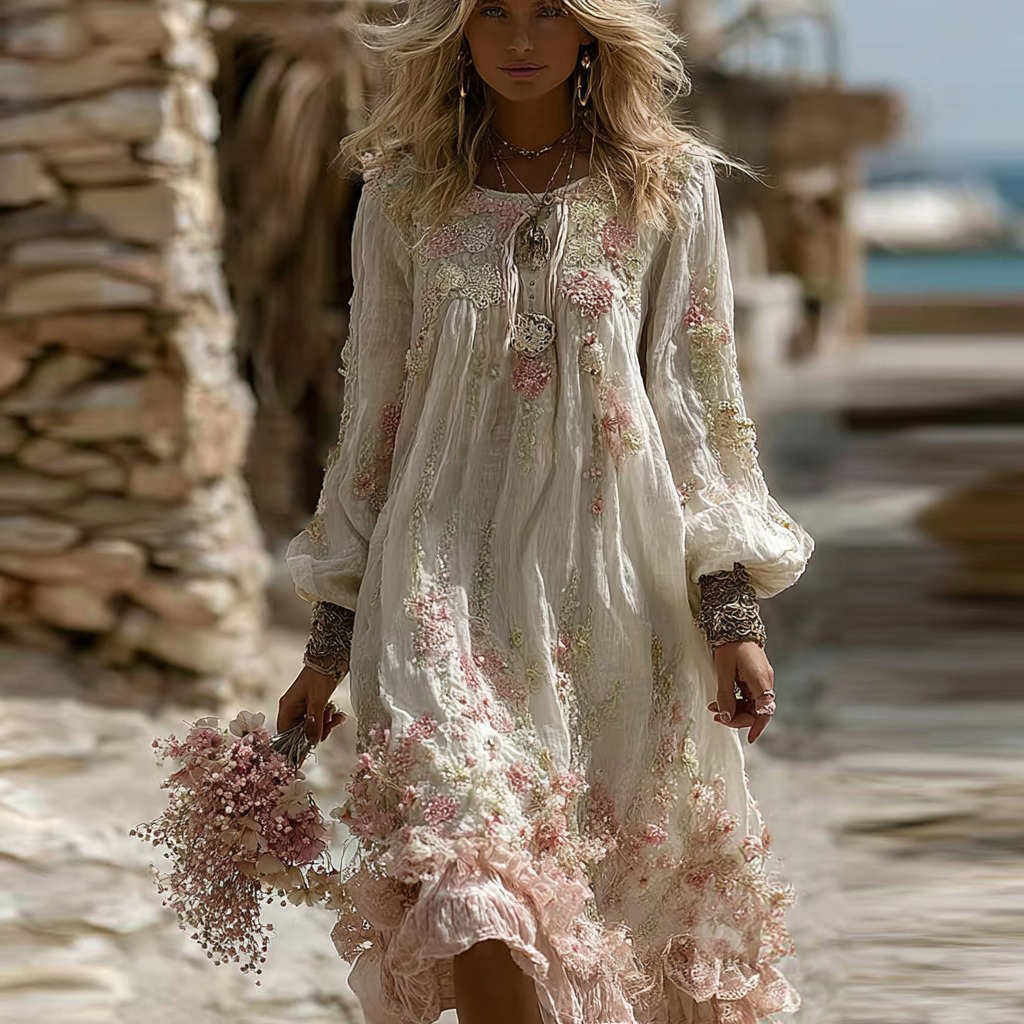 Women's Vintage Gypsophila Floral Pattern Casual Linen Maxi Dress
