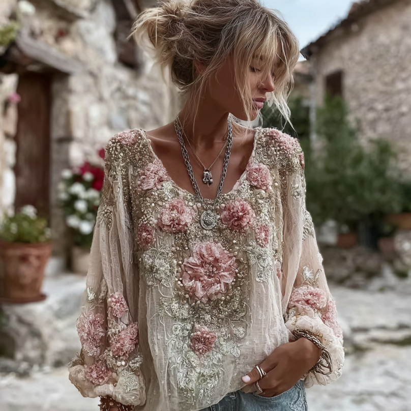 Women's Vintage Pink Flower Embroidery Art Round Neck Linen Blend T-shirt