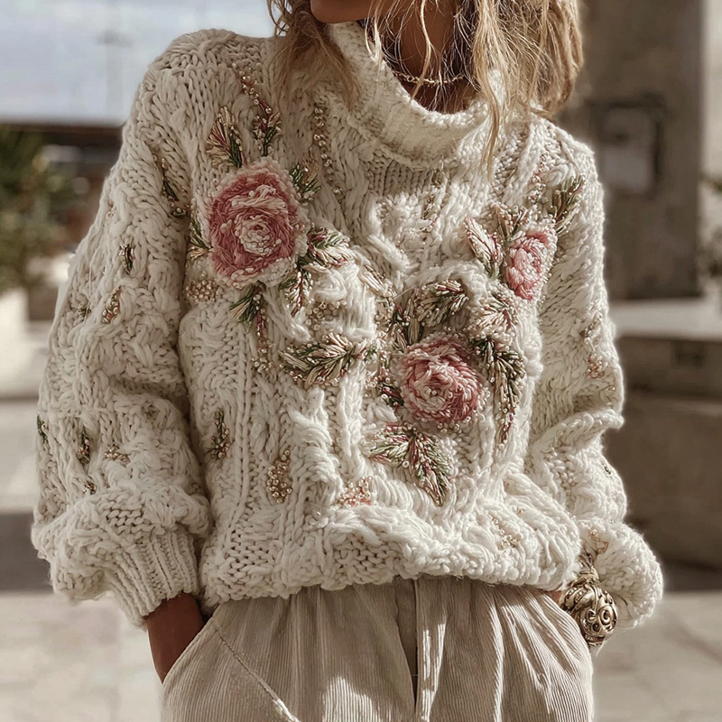 Women's Vintage Pink Rose Art Cozy Knit Turtleneck Sweater