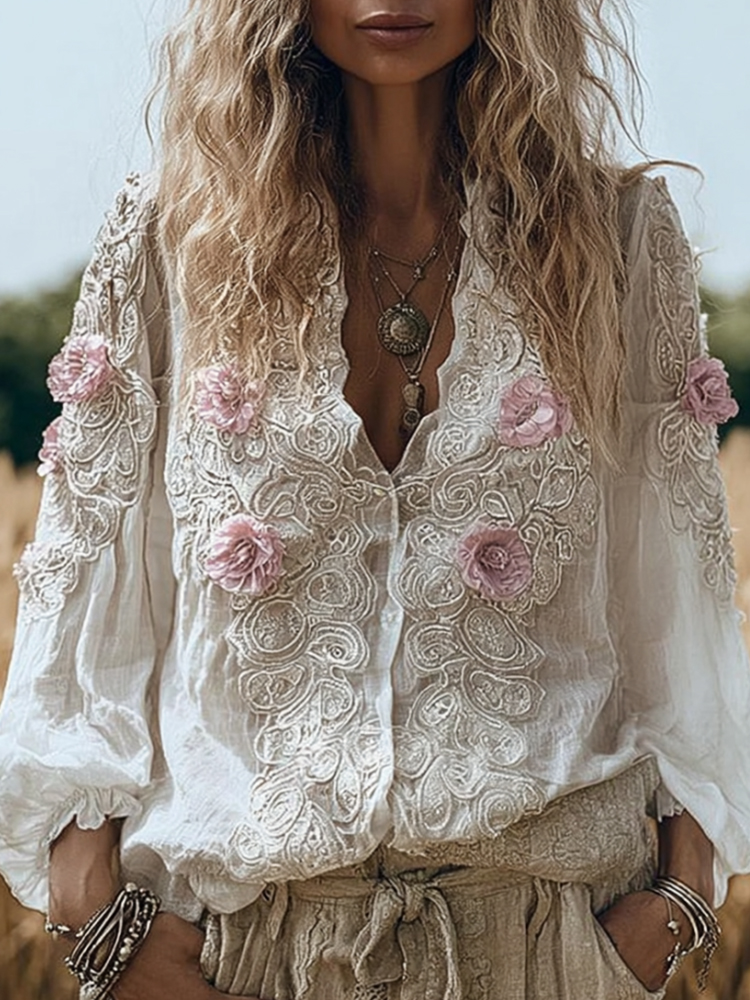 Women's Vintage Romantic Floral White Shirt