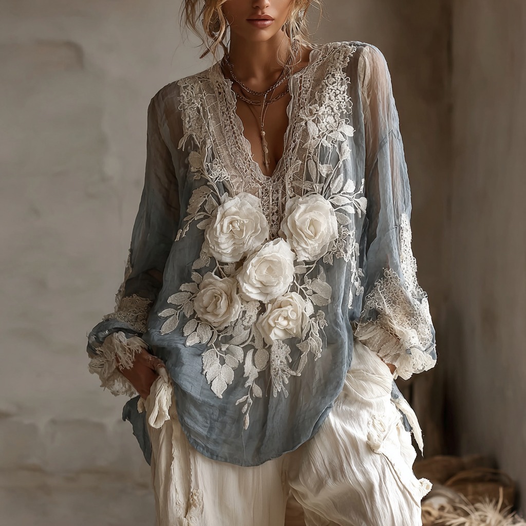 Women's Vintage Rose Embroidery Gradient Linen V-neck Shirt