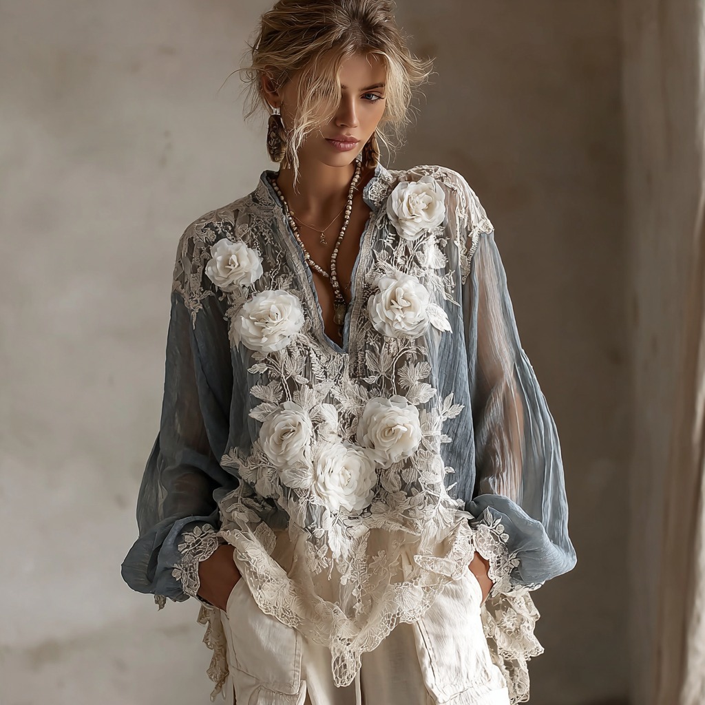 Women's Vintage Rose Embroidery Gradient Linen V-neck Shirt