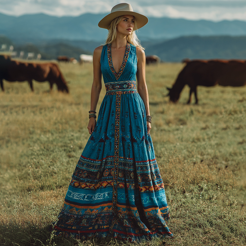 Women's Vintage Western Print V-neck Sleeveless Maxi Dress